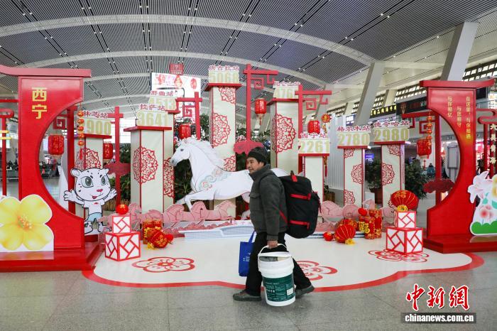 2月2日,2026年中國春運首日,旅客從西寧火車站裝扮的馬年氛圍裝飾區(qū)前走過。馬銘言 攝