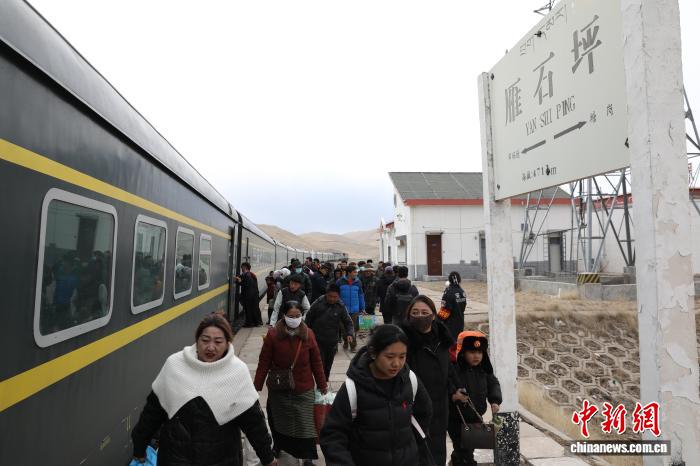 2月11日,西藏安多牧民等乘客在青藏鐵路雁石坪站乘車。仁增 攝