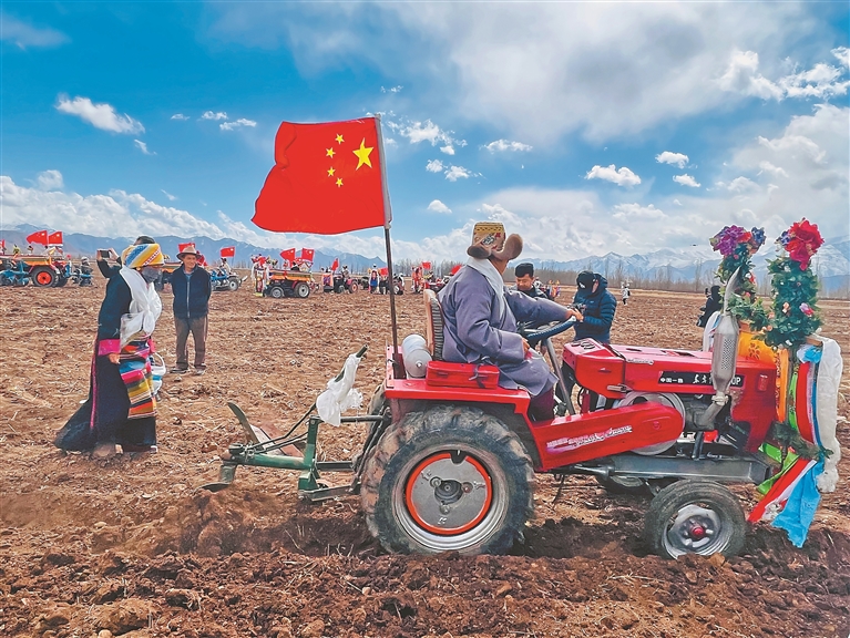 開耕儀式上,村民身著節(jié)日盛裝,聚在田間地頭,拖拉機等農(nóng)機設(shè)備擦拭一新,機頭鮮艷的五星紅旗迎風(fēng)招展。大家捧出切瑪盒,一字排開,互獻哈達、互敬青稞酒、同唱祝福歌,每個人臉上都洋溢著對豐收年景的期盼。