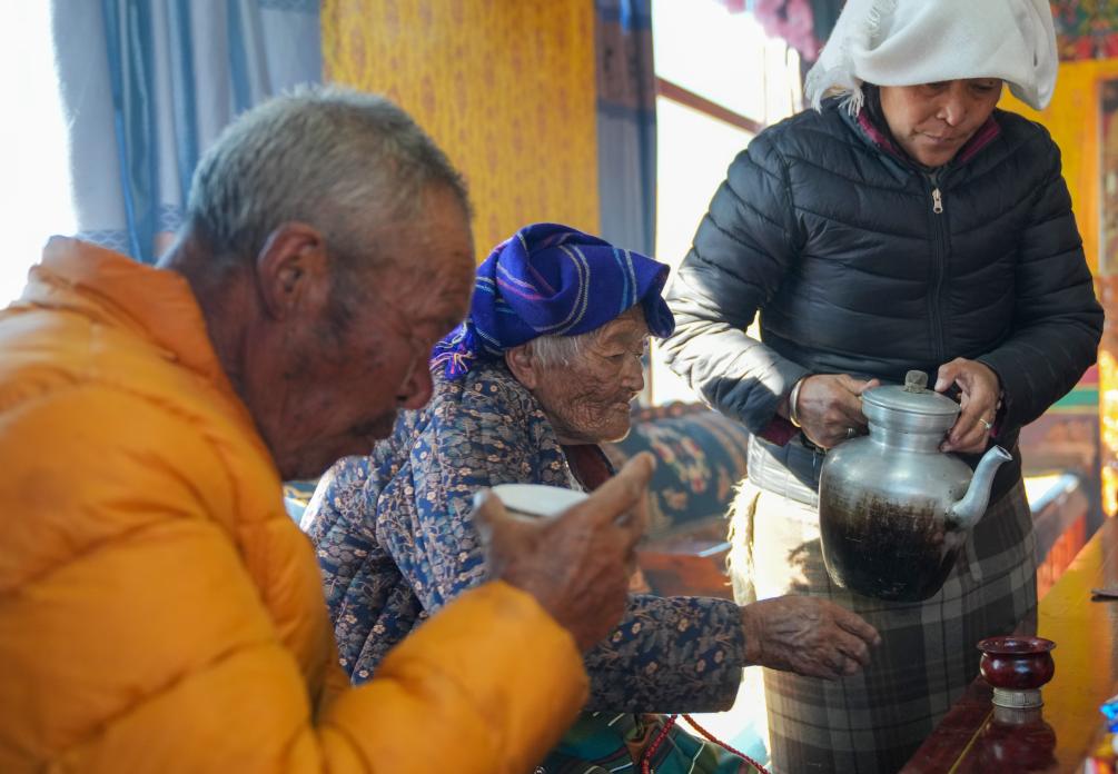 貢覺(jué)曲珍(中)和家人在家中喝酥油茶(3月6日攝)。