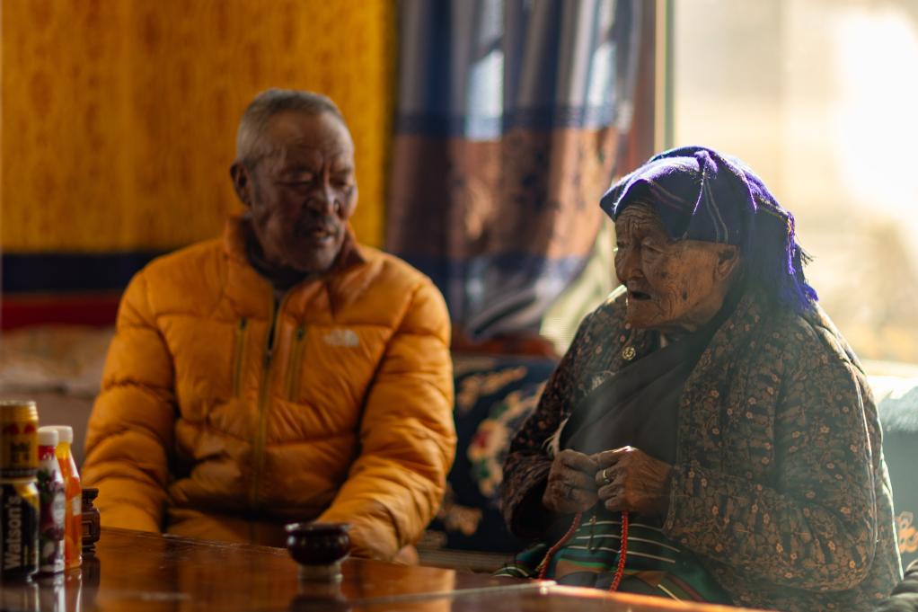貢覺(jué)曲珍(右)在家中和兒子聊天(3月6日攝)。