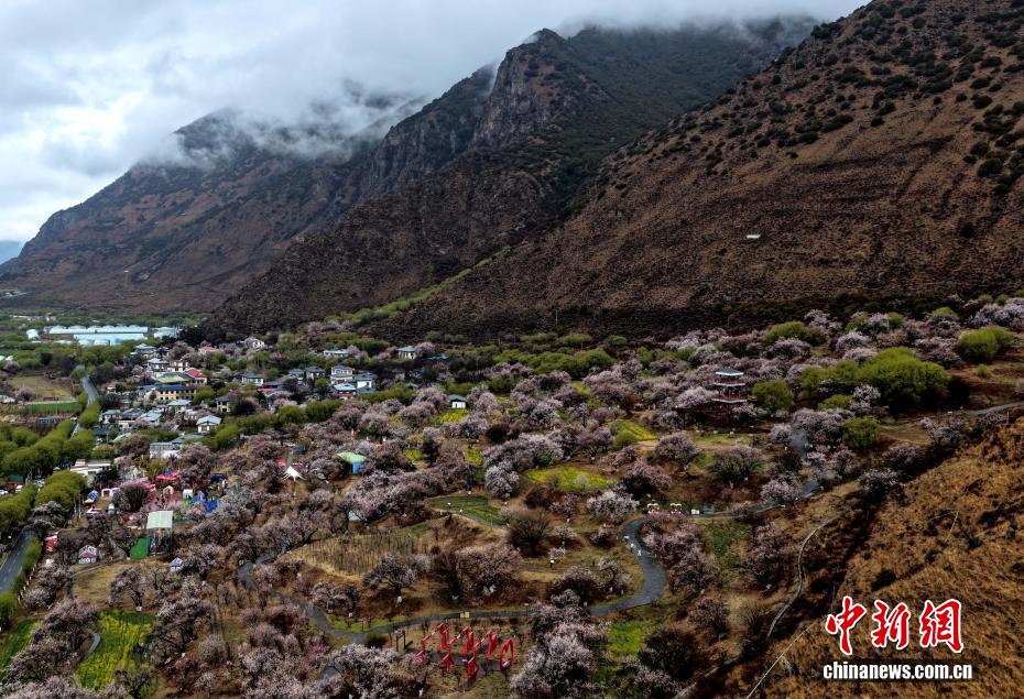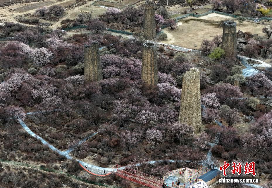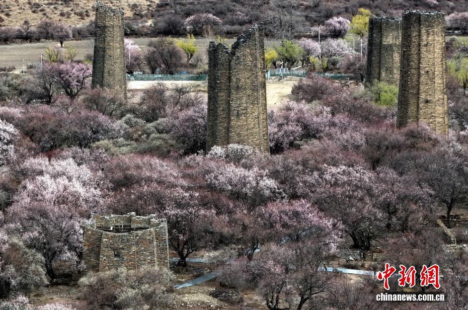 3月27日,西藏林芝市工布江達(dá)縣秀巴古堡群下桃花綻放。時(shí)下,西藏林芝市的千余株野生桃樹次第綻放,美不勝收。(無人機(jī)照片)中新社記者 李林 攝