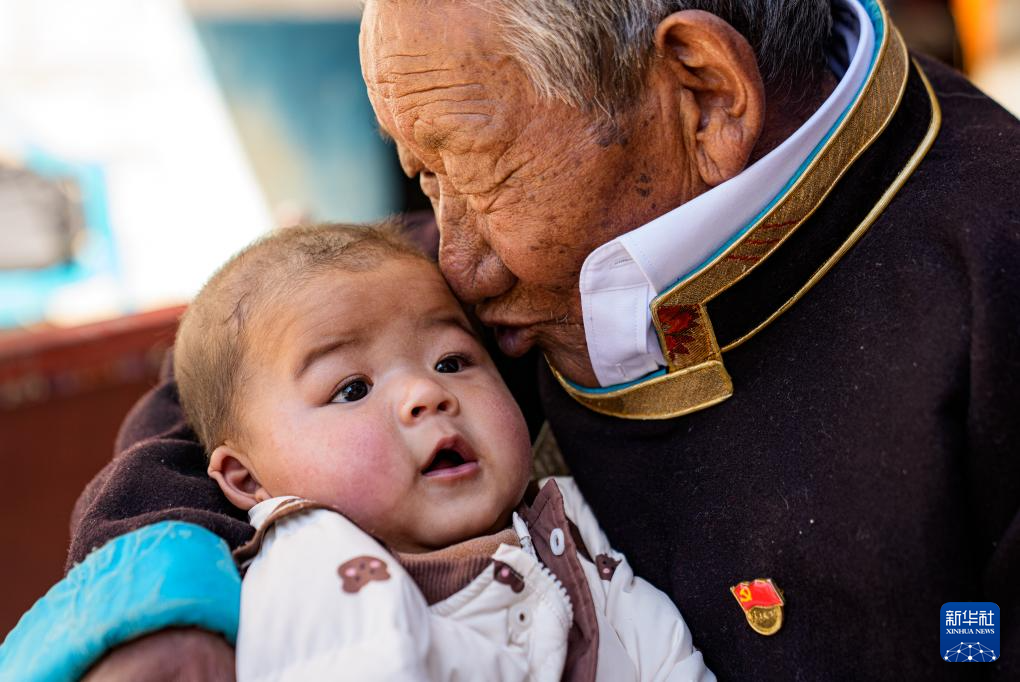 次仁桑珠在西藏山南市扎囊縣桑耶鎮(zhèn)的家中親吻曾孫(3月25日攝)。