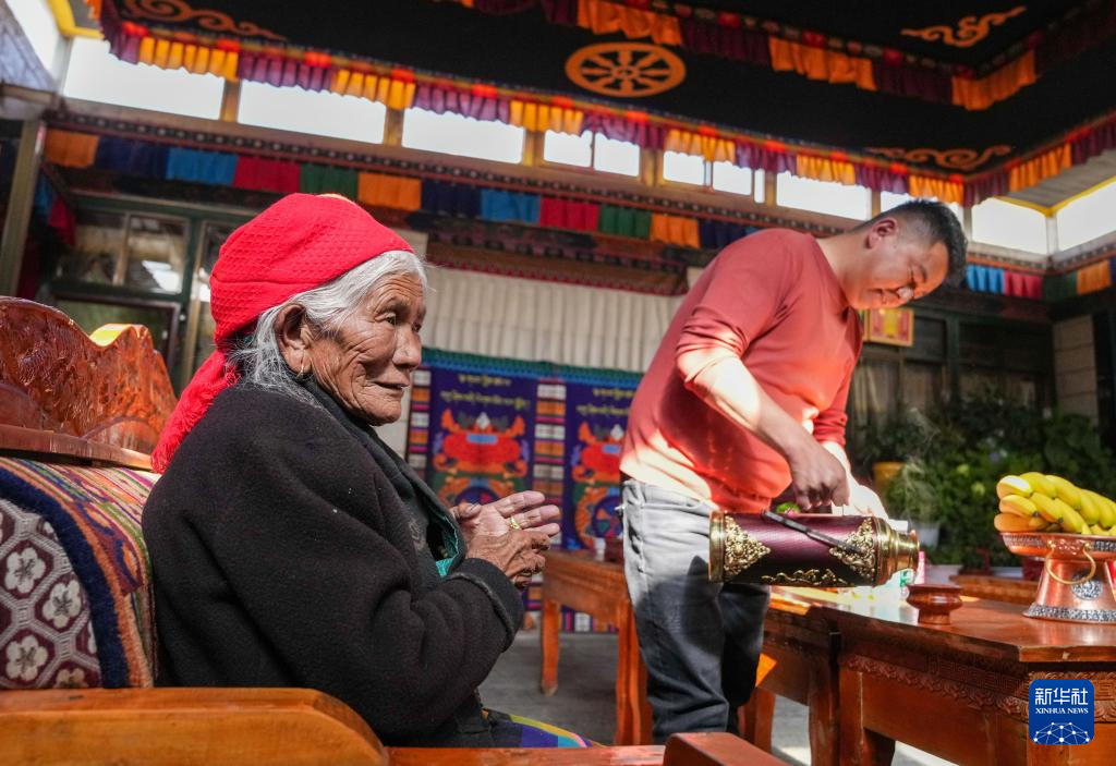在山南市乃東區(qū)昌珠鎮(zhèn)卡多村的家里,嘎多老人的孫子在給老人倒酥油茶(3月25日攝)。新華社記者 晉美多吉 攝