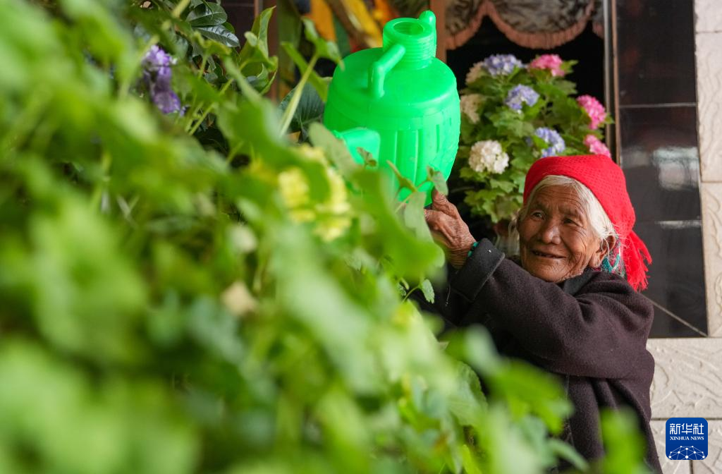 嘎多在家里澆花(3月25日攝)。新華社記者 晉美多吉 攝