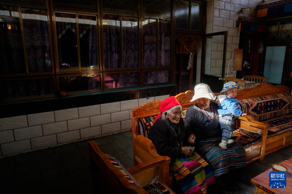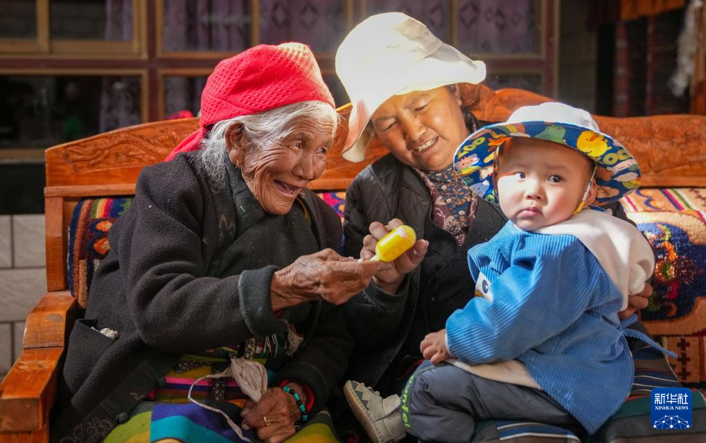 嘎多(左)在家里和兒媳逗弄曾孫(3月25日攝)。新華社記者 晉美多吉 攝