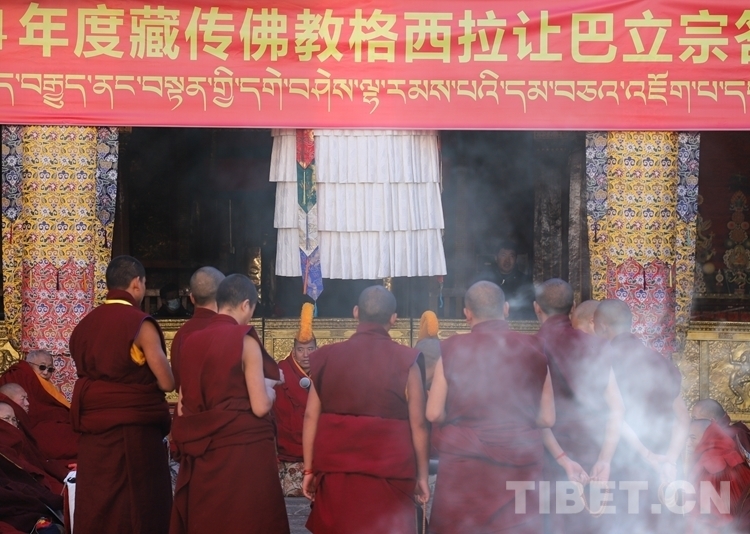 當日上午9時,立宗答辯儀式正式開始,儀式由藏傳佛教學經僧人考取格西拉讓巴學位考評委員會主持。按照傳統(tǒng)慣例,先舉行無齋佛事活動,在考評委員會的監(jiān)考下,應考格西拉讓巴學位的12名考僧輪流答辯陪考僧眾所提有關《釋量論》《般若學》《中觀學》《俱舍論》《戒學》五部經典方面的內容。立宗答辯儀式結束后,所有參加答辯儀式的僧人集體誦經祈禱,同時供齋茶齋飯。齋后,由西藏自治區(qū)宗教局負責人代表西藏自治區(qū)政府向參加答辯活動的僧人發(fā)放布施。