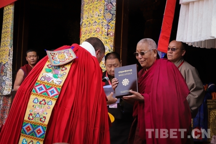 圖為佛協(xié)西藏分會副會長、扎什倫布寺堪布噶欽 多吉堅贊向獲得學位的考僧獻哈達并頒發(fā)學位證書 攝影:賈華加