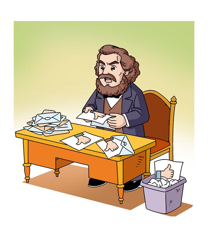 馬克思在一封信里說(shuō):“由于厭惡一切個(gè)人崇拜,在國(guó)際存在時(shí)期,我從來(lái)不公布那許許多多來(lái)自各國(guó)的、使我厭煩的歌功頌德的東西;我甚至從來(lái)不予答復(fù),偶爾答復(fù),也只是加以斥責(zé)?!?蘇凝/畫(huà)