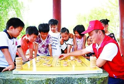 河北省河間市團(tuán)市委組織青年志愿者開展“微愛接力”農(nóng)村留守兒童志愿幫扶公益活動。新華社發(fā)
