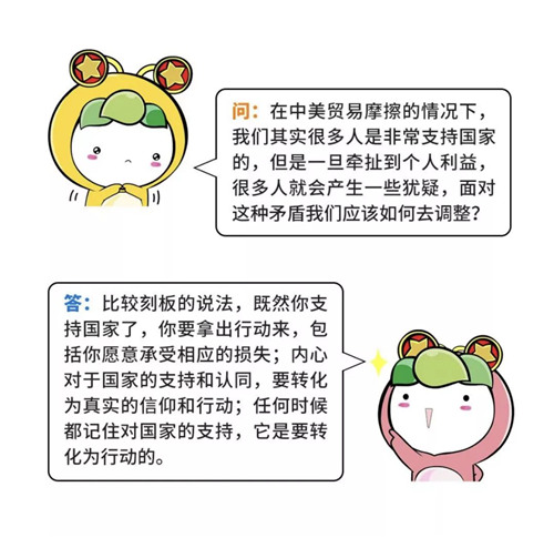 面對(duì)短期的困難和波動(dòng),青年人要清楚“美國(guó)在貿(mào)易戰(zhàn)中提出的要價(jià),不是小打小鬧”,應(yīng)該堅(jiān)定立場(chǎng),“抗?fàn)幍降住保惨帮L(fēng)物長(zhǎng)宜放眼量”,避免局限于眼前的小確幸,被暫時(shí)的挫折和困難所擊倒,要有與國(guó)家民族的發(fā)展同方向的扎實(shí)的行動(dòng),在實(shí)踐中實(shí)現(xiàn)自我價(jià)值。