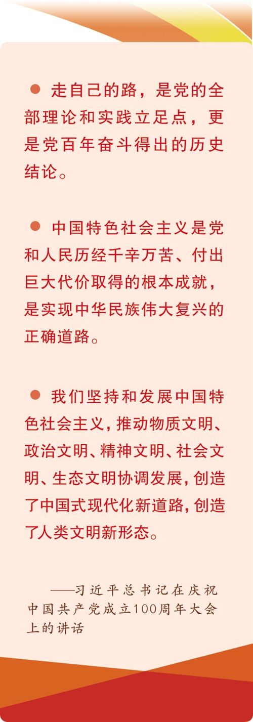 習近平總書記在慶祝中國共產(chǎn)黨成立100周年大會上強調(diào),“以史為鑒、開創(chuàng)未來,必須堅持和發(fā)展中國特色社會主義”“我們堅持和發(fā)展中國特色社會主義,推動物質文明、政治文明、精神文明、社會文明、生態(tài)文明協(xié)調(diào)發(fā)展,創(chuàng)造了中國式現(xiàn)代化新道路,創(chuàng)造了人類文明新形態(tài)”。
