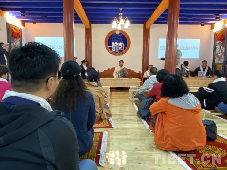 圖為松潘縣象藏藝術(shù)學(xué)校創(chuàng)辦人赤增饒旦為華文媒體記者介紹學(xué)校及唐卡傳承情況