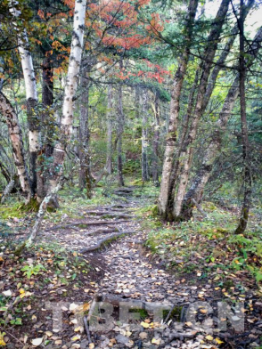 走過一段跨湖棧道,來到一片原始森林。森林里林立著參天的云杉,大的要兩個大人才能合抱完。云杉之上掛滿了樹須,就像古樓門上的珠簾,曉風(fēng)過處搖搖曳曳,別有一番韻味。
