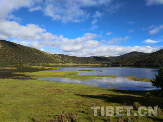 下了觀光車沒走幾步,位于香格里拉縣城東北方的屬都湖如約相見。站在橋上極目望去,湖泊宛若一顆滑落于雪域高原的明珠,低低的云彩倒映在湖面上,與瀲滟的波光交融在一起,幻化成一幅水光接天的畫景。步道B就位于屬都湖右岸,可謂占盡天時地利。游客都愛到這里散步觀景,因此一直都熱熱鬧鬧的。
