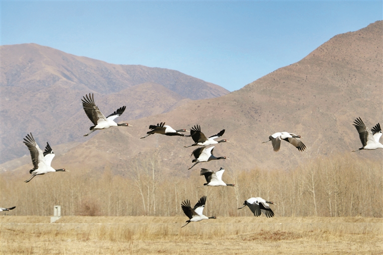 隨著氣溫逐漸下降,大批遷徙候鳥來到西藏拉薩市。在拉薩河谷、拉魯濕地、宗角祿康公園及田間地頭,成群結(jié)隊(duì)的鳥兒在波光粼粼的水面上時(shí)而低頭覓食、時(shí)而嬉戲、時(shí)而悠閑飛舞,冬日的高原呈現(xiàn)出一派生機(jī)勃勃的景象。圖為拉薩市達(dá)孜區(qū)田野上空飛翔的黑頸鶴。記者 平措旺堆 攝