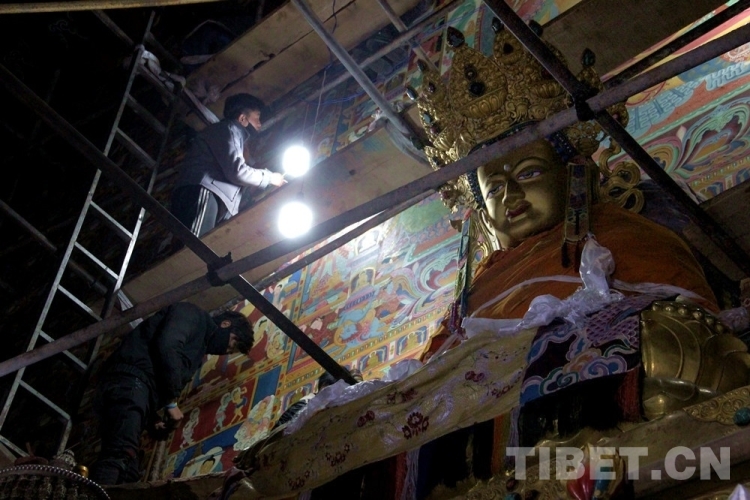 圖為扎巴旦增等類烏齊縣唐卡畫師們站在簡易腳手架上,借著燈光,修復(fù)壁畫 攝影:李元梅