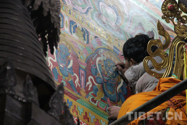 1320年,二世法臺(tái)鄔金貢布按照桑吉翁遺囑,邀請(qǐng)了尼泊爾藝術(shù)家雜雅、拉薩人貢唐巴·旺措蚌、多康·索朗本等人修建了查杰瑪大殿。大殿建成后尼泊爾藝術(shù)家在大殿底層內(nèi)壁及外廊、內(nèi)廊等墻面繪制了壁畫。幾百年來,當(dāng)年極具尼泊爾藝術(shù)風(fēng)格的壁畫已依稀斑駁,當(dāng)?shù)卣M織了本地唐卡畫師對(duì)壁畫進(jìn)行修復(fù)。圖為畫師們在大殿一層“花殿”內(nèi)修復(fù)壁畫 攝影:李元梅