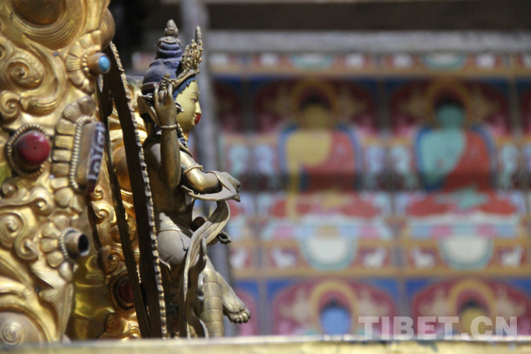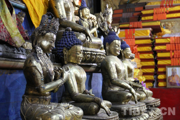 查杰瑪大殿內(nèi)供奉著金、銀、烏銅、檀香木等材料制作的4萬多件藏傳佛教造像,在大殿中,不經(jīng)意間就會(huì)與不少國家級(jí)文物和高僧大德的塑像相遇。圖為查杰瑪大殿二層“紅殿”內(nèi)供奉的釋迦牟尼佛水印像,相傳為釋迦牟尼在世時(shí)鑄造。 攝影:李元梅