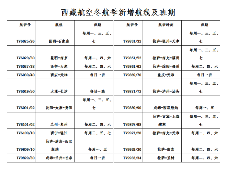 中國(guó)西藏網(wǎng)訊 10月25日,西藏航空將正式進(jìn)入冬航季。在今年的冬航季,西藏航空在原有航線網(wǎng)絡(luò)布局的基礎(chǔ)上進(jìn)行了優(yōu)化調(diào)整,新開(kāi)拉薩—南京、拉薩—宜賓—上海浦東、成都—西雙版納等20條國(guó)內(nèi)航線(新開(kāi)航線及班期詳見(jiàn)表格)。