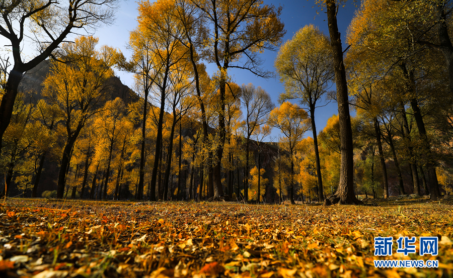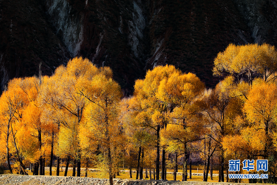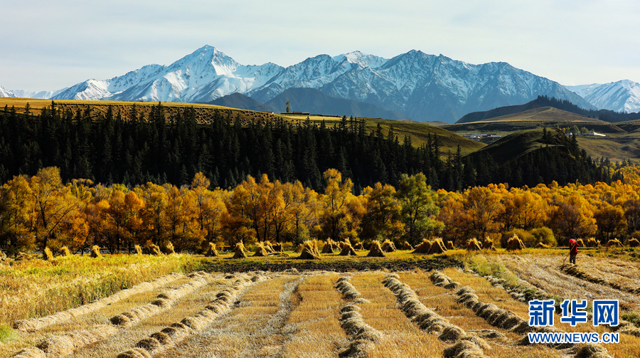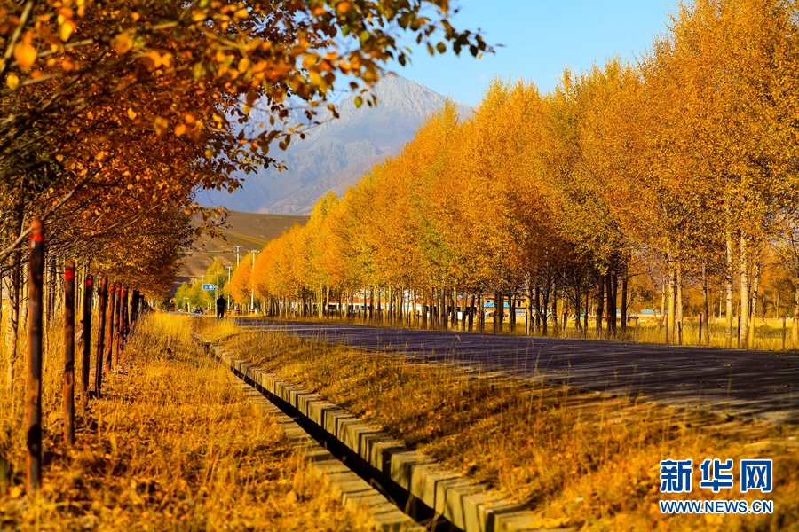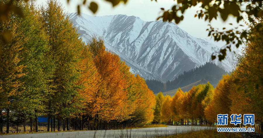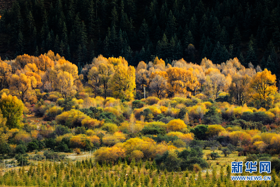 金黃色的樹木與遠(yuǎn)山交相輝映,處處呈現(xiàn)出醉人的美景。新華網(wǎng) 蘇金元攝