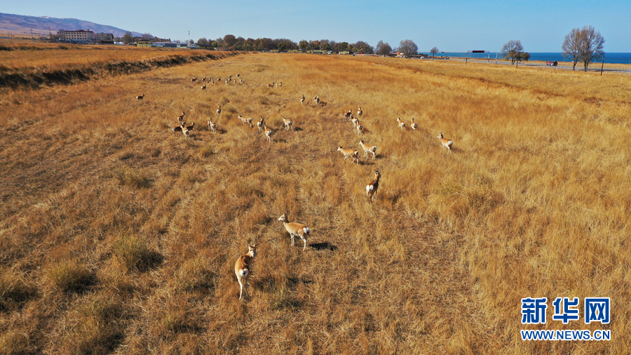 深秋時節(jié)的青海湖,芳草萋萋,遍地金黃。漫步在湖畔草原上的普氏原羚,幾乎與金黃的牧草融為一體。它們時而跳躍、時而奔走,就像湖邊一群群舞動的精靈。