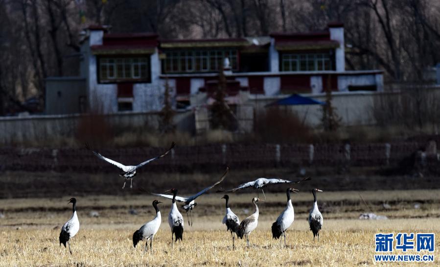 這是12月12日在林周縣黑頸鶴自然保護區(qū)卡孜鄉(xiāng)拍攝的黑頸鶴。新華社記者 黃豁 攝