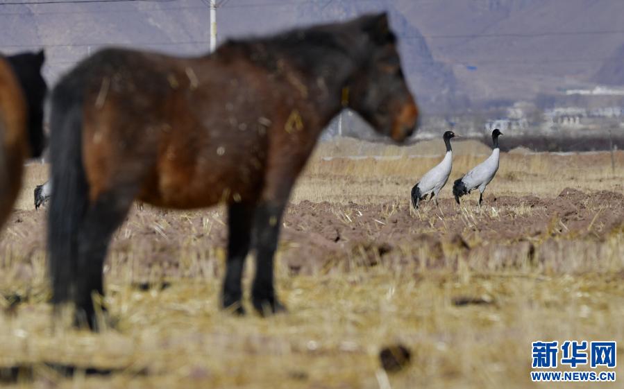 棲息在林周縣卡孜鄉(xiāng)農田里的黑頸鶴(12月12日攝)。新華社記者 張汝鋒 攝