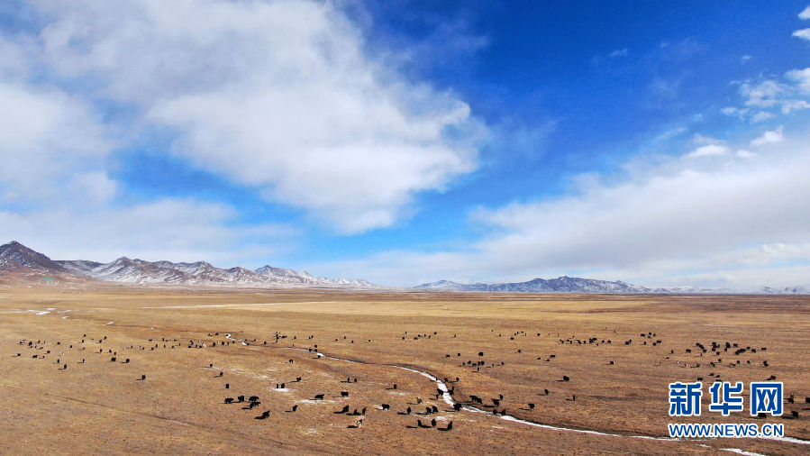 在青海省祁連縣,一群牦牛在草原上活動(dòng)(12月10日攝,無(wú)人機(jī)照片)。新華社記者 張宏祥 攝