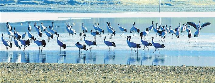 在冬日暖陽的照耀下,成群結(jié)隊的鳥兒在河面上、濕地里盡情嬉戲,赤麻鴨悠然戲水、斑頭雁低聲吟唱、黑頸鶴翩翩起舞……一派熱鬧的景象。
