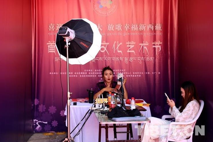 圖為在首屆西藏文化藝術節(jié)主場地——拉薩市金城公主劇場附近工作人員正在進行直播帶貨 攝影:王佳豪