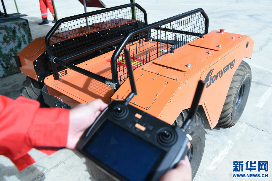 8月5日,工作人員在拉薩基地演示遙控水陸兩棲隨行機(jī)器人。新華網(wǎng) 旦增努布 攝