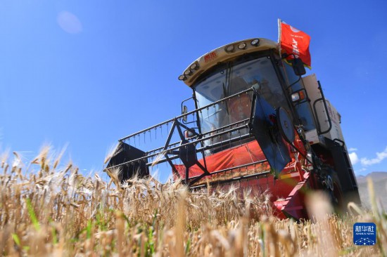西藏日喀則市江孜縣熱索鄉(xiāng)努康村農機合作社的村民集中對村里三千多畝耕地進行機械化收割(9月19日攝)。記者 晉美多吉 攝