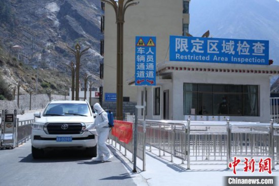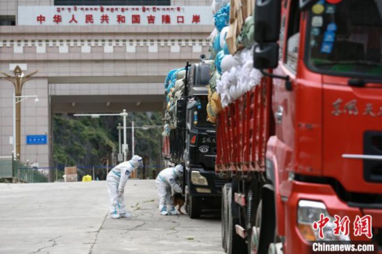 吉隆出入境邊防檢查站移民管理警察對外出口岸限定區(qū)域車輛進(jìn)行消毒?!⌒じ毁F 攝