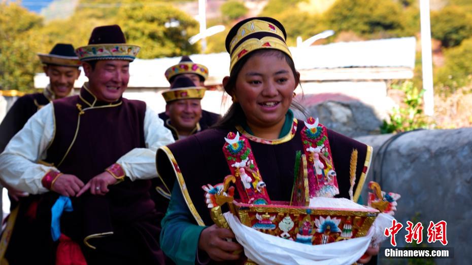 11月24日恰逢藏歷十月初一,西藏林芝迎來2023年工布新年,這是西藏最早的新年。工布新年以其悠久的歷史、鮮明的特色、豐富的內(nèi)涵,于2006年被列入第一批西藏自治區(qū)非物質(zhì)文化遺產(chǎn)保護名錄。圖為村民身著節(jié)日盛裝手捧“切瑪”拜年。 土旦曲扎 攝