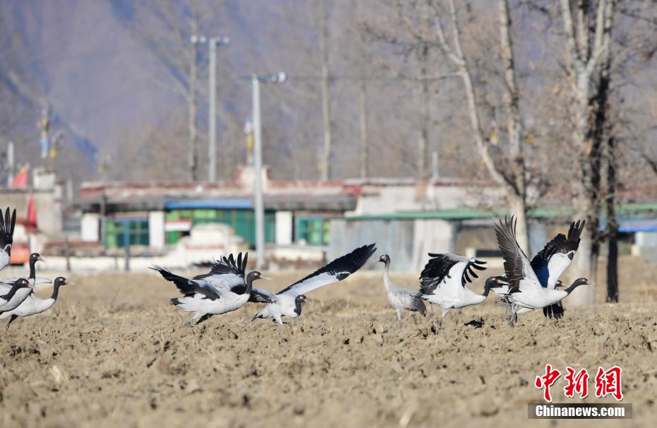 每年的10月底,成群的黑頸鶴飛到西藏拉薩市林周縣越冬,在拉薩市林周縣周邊的湖泊濕地度過5個月的“閑云野鶴”生活,次年三四月份再飛向藏北草原繁殖。黑頸鶴是世界上唯一一種高原鶴類。具有足長、喙長、頸長的典型涉禽類特征,適合在沼澤地里行走。黑頸鶴的頸、尾為黑色,體羽為灰白色。黑頸鶴是國家一級保護(hù)動物。目前,每年到林周縣越冬的黑頸鶴已達(dá)2000只左右。圖為黑頸鶴在林周境內(nèi)的農(nóng)田里飛翔。 貢嘎來松 攝