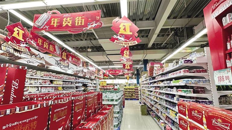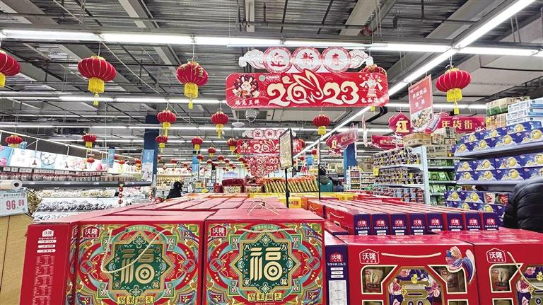 新年到,購買年貨不可少。走進(jìn)大麥超市,寫有“新年快樂”字樣的標(biāo)語牌隨處可見,一副副寓意吉祥的對聯(lián)、各式各樣的“?!弊帧艋\等新年裝飾,把春節(jié)的氣氛烘托得喜慶十足。貨架上,新鮮蔬菜、米面糧油、糖果點心、酒水飲料等熱銷年貨種類繁多、一應(yīng)俱全,人們喜氣洋洋地穿梭在貨架旁,精心挑選著心儀的物品。市民張女士正在挑選對聯(lián),她告訴記者:“今年我們?nèi)叶荚诶_過年,想把家里好好裝飾一下,讓過年的氛圍更濃一些。新年要有新氣象,我希望家人平平安安、健健康康。”