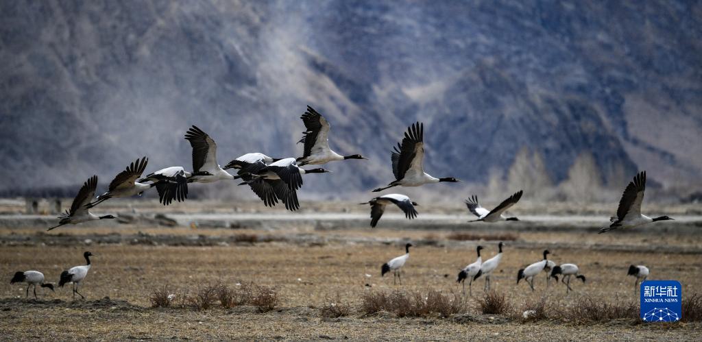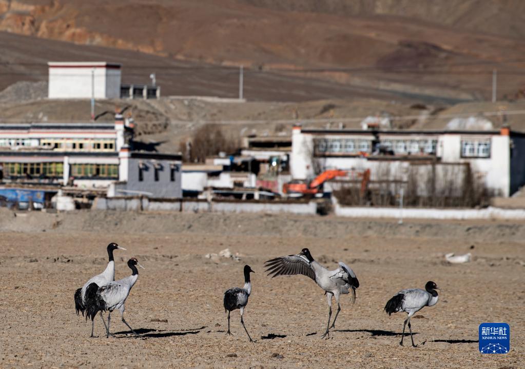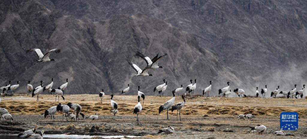 在西藏雅魯藏布江中游河谷黑頸鶴國(guó)家級(jí)自然保護(hù)區(qū)日喀則片區(qū)拉孜縣附近,大量越冬的黑頸鶴翩翩起舞,迎接春天的到來(lái)。