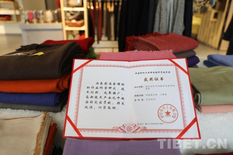 牦牛的生存環(huán)境決定了牦牛絨比普通羊毛更加保暖、柔軟,但也帶來了紡織上的技術難題。牦牛絨很細,纖維的卷曲較少并且卷曲形態(tài)不規(guī)則,成條成紗難度大。在不斷的探索中,團隊發(fā)現(xiàn)牦牛絨與蠶絲混紡能改善牦牛絨的可紡性,這解決了一大技術難題,公司還因此獲得知識產權專利及多項科學技術獎項。