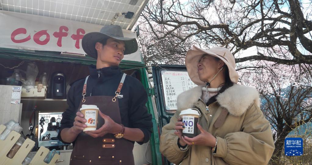 桃花谷中,咖啡車停在桃樹下,車后遠(yuǎn)處是連綿的雪山。樹上的桃花被風(fēng)吹落,一朵花瓣剛巧落在還未來得及封蓋的咖啡里,但顧客對(duì)此并不在意,“這才有林芝春天的感覺!”他說。
