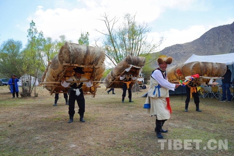 當(dāng)天恰好是周六,從拉薩來(lái)體驗(yàn)的游客不在少數(shù),有的是觀看了抖音直播就馬上騎車過(guò)來(lái)體驗(yàn)的。在營(yíng)地,大家欣賞到了當(dāng)?shù)氐摹肮挝琛保ㄅFご瑁?,廓孜由邊唱邊跳的“阿熱”和身背牛皮船跳舞的“船夫”合作表演?!鞍帷笔枪挝柚械念I(lǐng)舞者,跳牛皮船舞時(shí),“阿熱”手執(zhí)“塔塔”(五彩旗桿),唱著歌,跳著舞,另外4位舞者看著“阿熱”的動(dòng)作,背著重約80斤的牛皮船,用同樣的動(dòng)作跟著“阿熱”跳舞。大家動(dòng)作整齊,船漿擊打船舷的“咚咚”聲不絕于耳。