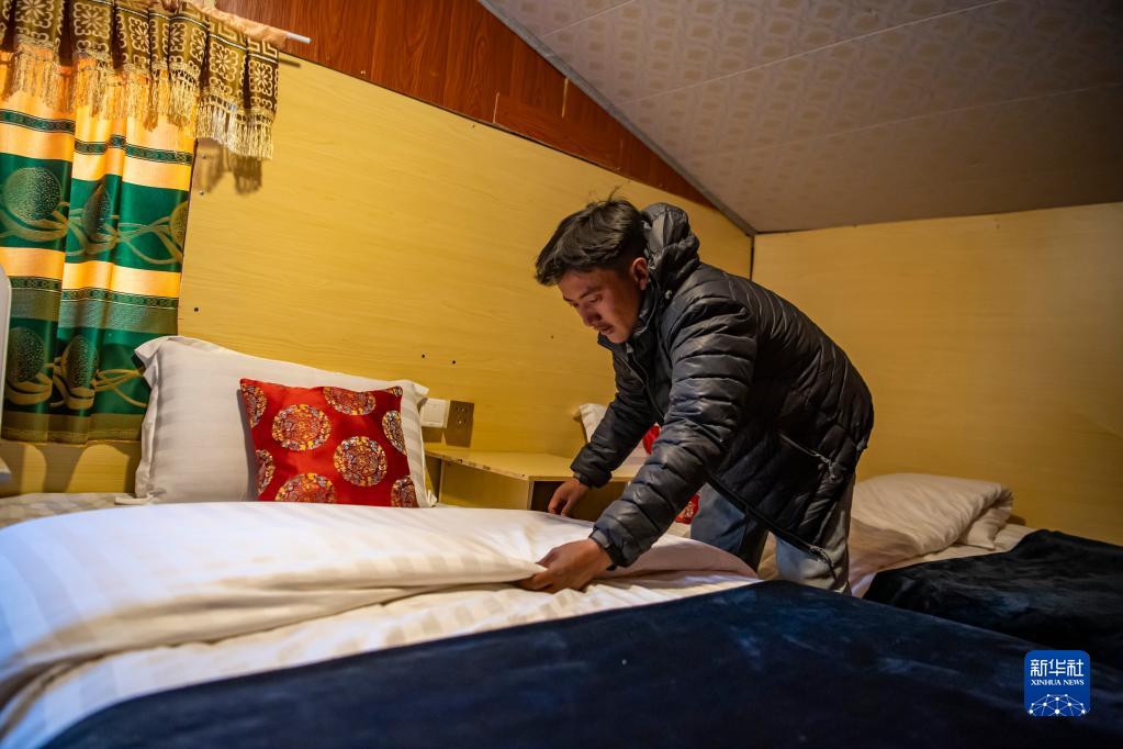 在珠峰游客大本營(yíng)的帳篷旅館,旦增在整理床鋪(5月13日攝)。新華社記者 孫非 攝