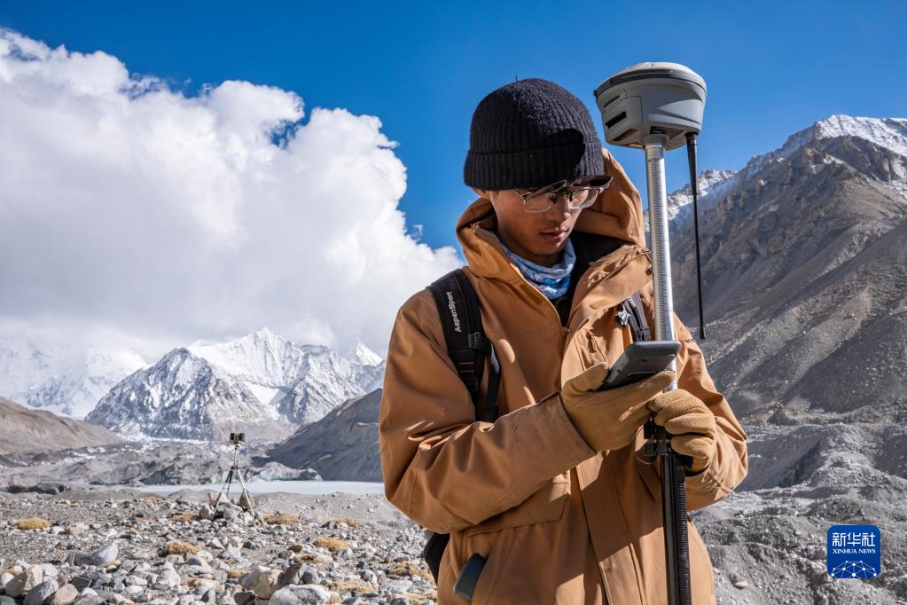 在珠峰海拔約5300米處,來(lái)自中國(guó)科學(xué)院西北生態(tài)環(huán)境資源研究院的科考隊(duì)員薛雨昂在對(duì)冰川進(jìn)行實(shí)時(shí)差分GPS定位(5月15日攝)。新華社記者 晉美多吉 攝
