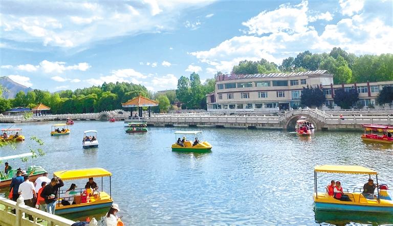 圖為市民、游客在慈松塘水上公園乘船游玩。記者 洛桑 攝