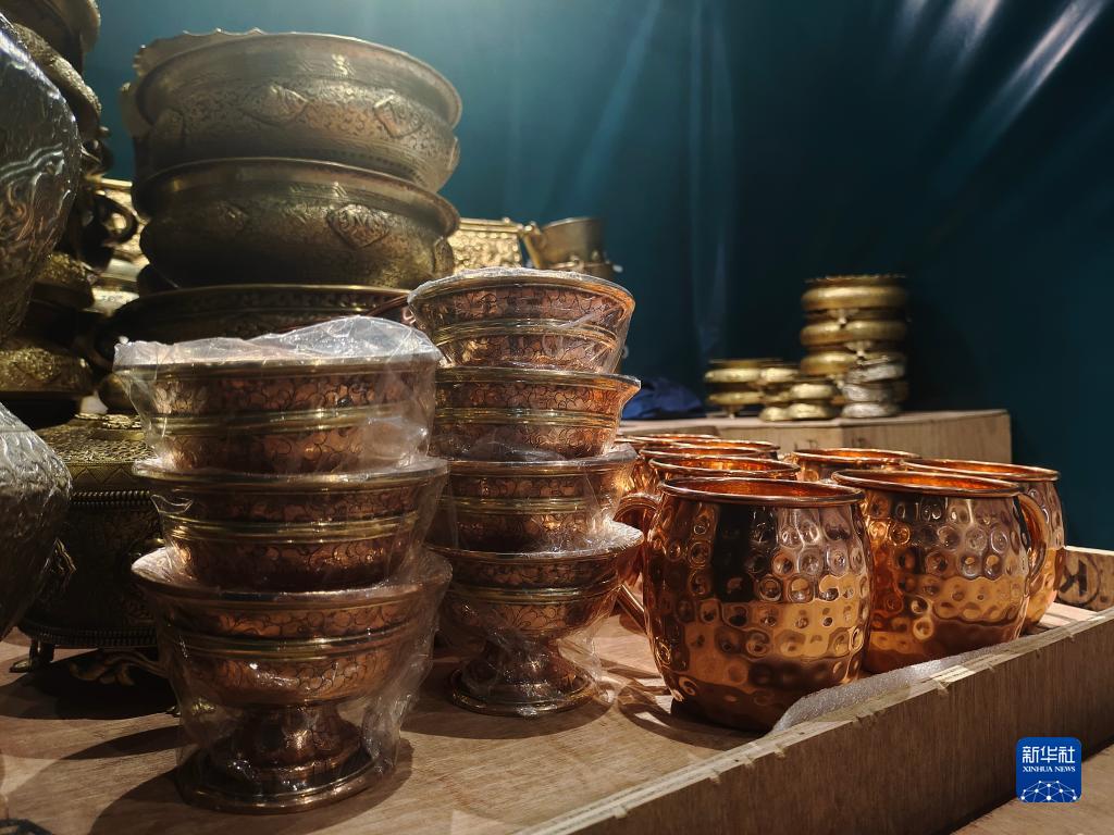 這是藏博會上的尼泊爾銅器展示點(diǎn)位。新華社記者 劉洲鵬 攝