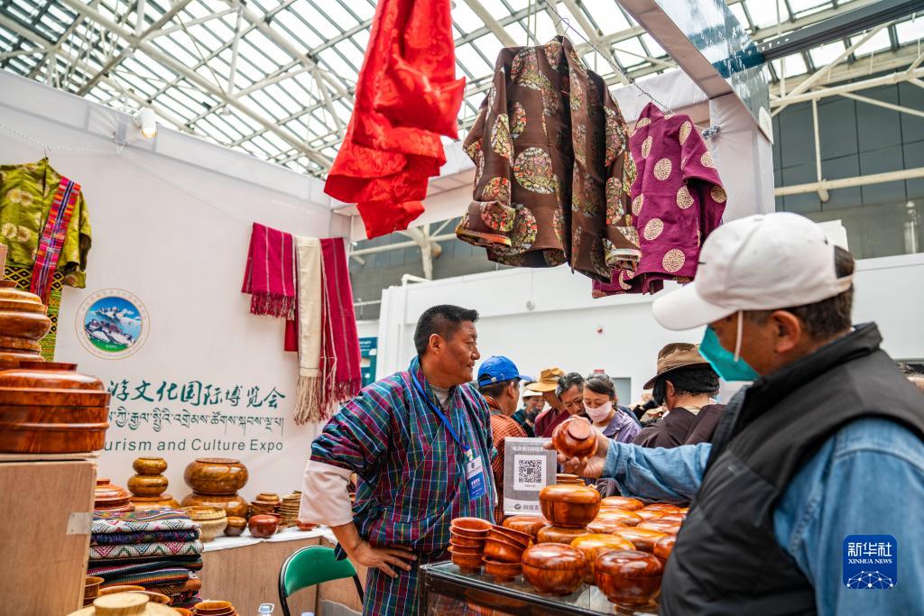 在第五屆藏博會現(xiàn)場,來自不丹的參展商旺楚克·澤帕(左一)跟顧客交談(6月18日攝)。新華社記者 孫非 攝