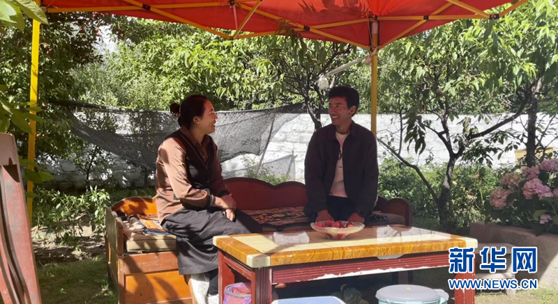 圖為嘎拉村村民達(dá)瓦參堅(jiān)和妻子在自家的院子里聊天,身后是小菜園和不同的果樹。新華網(wǎng) 陳穎 攝
