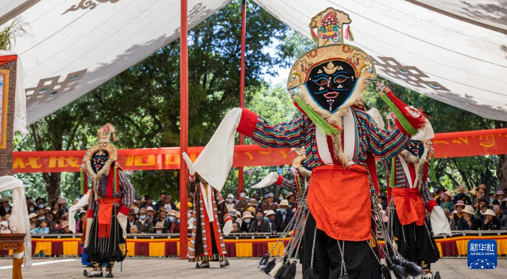 8月19日,在拉薩市羅布林卡園林內(nèi),貢嘎縣乃薩藏戲隊在表演藏戲《朗薩雯崩》。新華社發(fā)(丁增尼達攝) ??