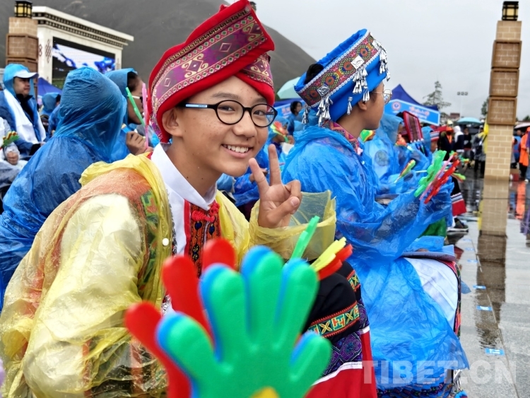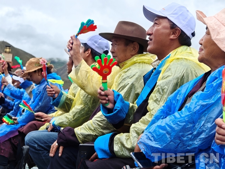 當天上午,雨水時急時緩下著。當地民眾撐著傘、披著雨衣早早落座等待演出開始。白瑪次仁是附近的村民,他告訴記者:“我平時就喜歡唱歌和跳舞,所以收到有文藝演出的通知就早早過來觀看,畢竟平時很少看到如此大型的演出?!?/p>