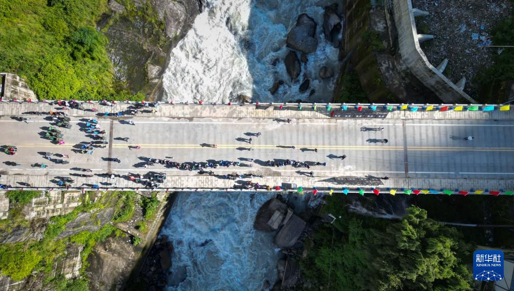 9月1日,往來(lái)中尼兩國(guó)的人員跨過(guò)友誼橋(無(wú)人機(jī)照片)。新華社記者 聶毅 攝